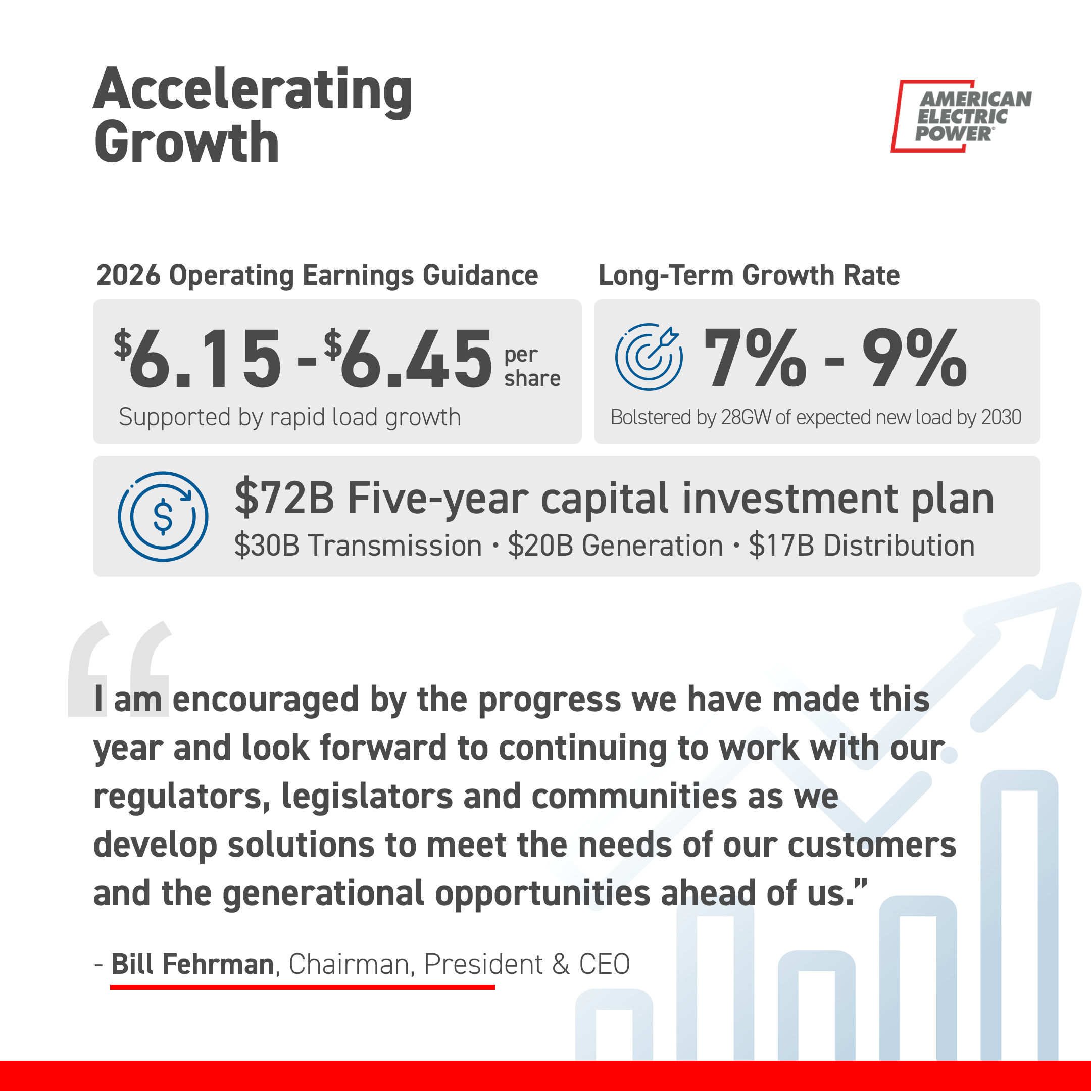 AEP today announced a new, increased long-term operating earnings growth rate of 7-9% over the next five years, bolstered by a $72 billion capital plan and supported by an expected 10% annual growth in rate base. During the first two years of the company’s plan, annual operating earnings growth is anticipated to be in the lower half of the range and at or above the high end of the range in 2028-2030. As infrastructure projects are put into service to meet customer demand, AEP expects operating earnings per share to increase at a 9% compounded annual growth rate over the five-year period. The rapidly accelerating load growth also supports AEP’s 2026 operating earnings guidance of $6.15 to $6.45 per share.