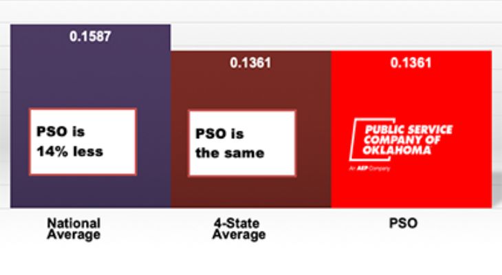 We're committed to delivering unmatched service. It means fewer outages and less outage time. It means that you will have more control over how and when you use electricity, which will allow you to save money. With prices that are at or below state, regional and national averages, PSO is priced right and your partner for energy.