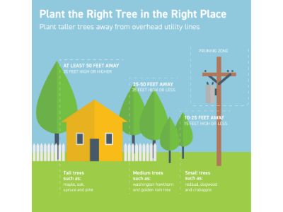 Height: Knowing the potential height of any trees you’re going to plant will help ensure branches will be clear of power lines once the tree is fully grown. Small trees such as redbud, dogwood and crabapple should be planted 10-25 feet away from power lines. Medium trees such as Washington hawthorn and golden rain trees should be planted 25-50 feet away from power lines. Tall trees such as maple, oak, spruce and pine should be planted at least 50 feet away from overhead lines.